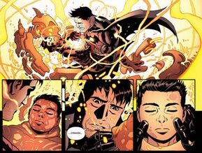 Damian va volando con su exoesqueleto y se mete de lleno en la pelea